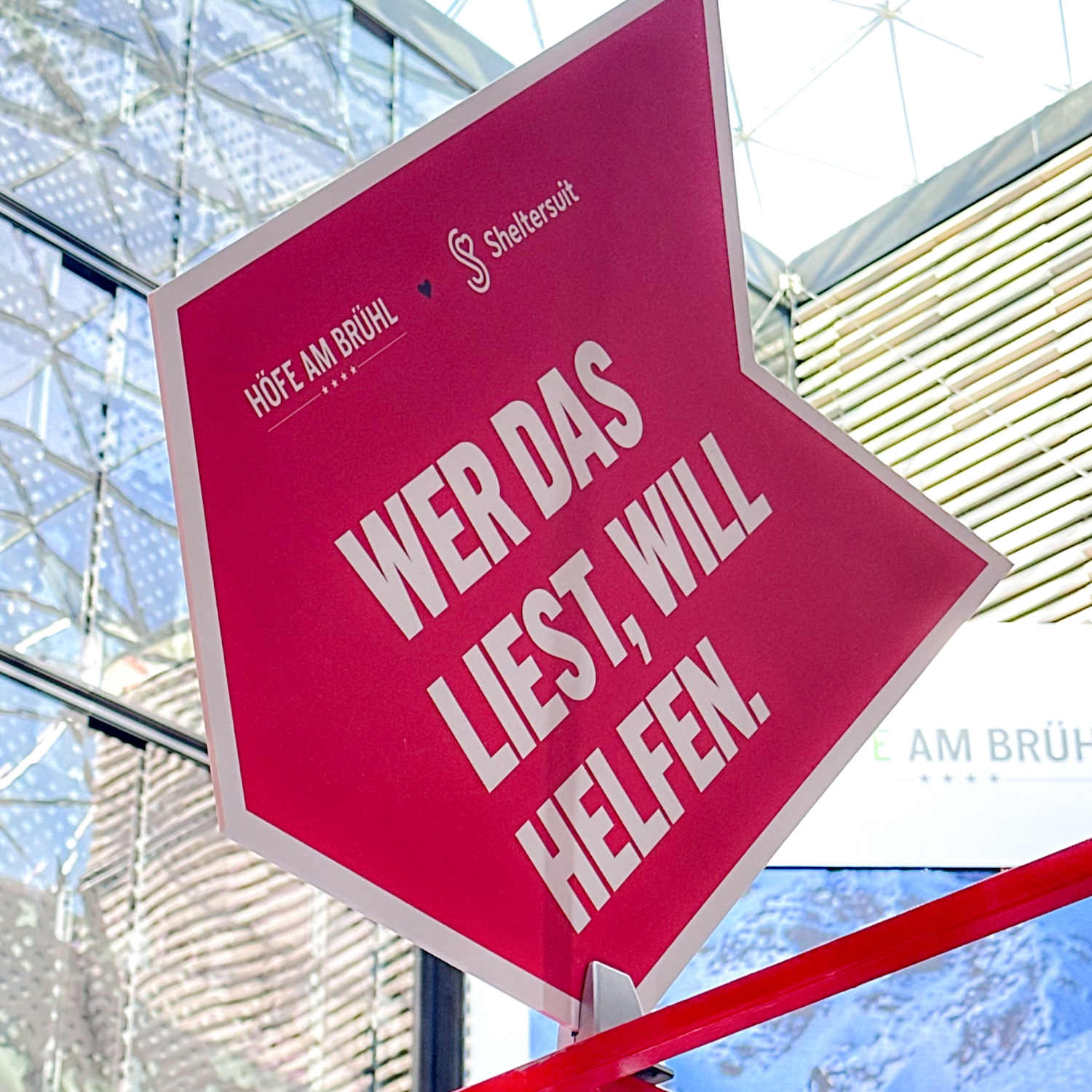 Höfe am Brühl, Sheltersuit Spendenstand im EG neben den Rolltreppen vor New Yorker